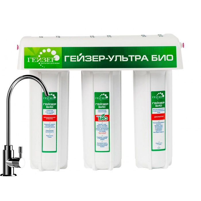 В фильтрах серии Гейзер Ультра БИО применена инновационная технология очистки воды. Сочетание картриджей Арагон–М БИО и Fiber Pro обеспечивают максимально возможное качество фильтрации, увеличенный ресурс, двойной ресурс по удалению бактерий и вирусов, а также прекрасный вкус чистой воды. Отсутствуют вредные выбросы для людей и окружающей среды. Корпус фильтра выполнен из пищевого пластика и выдерживает давление, превышающее рабочее в пять раз.